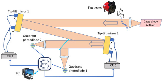 The setup to investigate the efficiency of the work of the beam-stabilization system is presented in Figure 7. The 50 mm laser beam distorted by a fan heater reflected from two tip-tilt mirrors, and the center of the beam was then detected with two quadrant photodiodes with a diameter of 10.2 mm, each placed at different distances from the light source (25 cm in our case). The data from the photodiodes was collected by the FPGA, and then the voltages to be applied to the piezo drivers of the mirrors to correct for the beam displacement were calculated. The FPGA sent commands to the control units (CU 1, CU 2) to change the voltages on the piezo drivers of the mirrors. Control units allow the application of voltages from −30 V to 190 V. We used a PC to adjust the system before the correction was started, to measure the response functions of each tip-tilt mirror, and to save the resulting data in an appropriate format.
