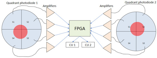 To calculate the control voltages, we used an algorithm based on the least square method [25]. The information on the beam position was collected from the quadrant photodiodes (Figure 10). We used FD-20KP quadrant photodiodes with a diameter of 10.2 mm and a gap of 0.3 mm between the four sectors. A standard 4-channel current-to-voltage conversion circuit on an operational amplifier [26] with a conversion factor of 1,000,000 was produced to transmit the signals from each quadrant photodiode. The beam diameter on the photodiodes was 5 mm.