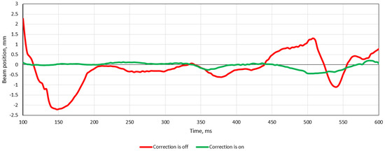 Figure 12 shows the measured fluctuation of the displacements on the first photodiode for 500 ms; the red line corresponds to the beam center position without any correction, and the green line shows the behavior of the beam center when correction is on.
