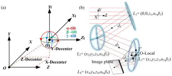In an off-axis system, the decenters and tilts of the local coordinate system of a surface relative to the global coordinate system can be used to describe the positional properties of that surface. The local coordinate system is generally defined with a local coordinate system origin at the center of the surface. Here, the center of a surface is defined as the vertex of its best-fit conic surface. The coordinate system for a surface can be shifted in the X, Y, and Z dimensions and tilted in the YZ, XZ, and XY planes relative to the coordinate system of the previous surface []. These shifts and tilts are illustrated in Figure 1a. When the coordinate system of the previous surface is the global coordinate system, these shifts and tilts are the X, Y, and Z decenters, and α, β, and γ tilts are used to describe the position of the surface local coordinate system, in which the definitions of α, β, and γ tilts are the same as those of tilt, pitching, and deflection in the mechanical field, which is conducive to the coordination of design and manufacture. Additionally, the coordinate system for the nonsymmetric systems is consistent with the definition of the optical surface coordinate system in CODEV, which is convenient for the further optimization of the starting point obtained by the proposed nonsymmetric design method.