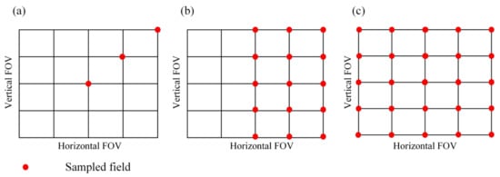 Before the calculations can be performed, the feature light rays as well as the starting and target points of the feature light rays must be defined. The feature light rays are the sample rays used for the calculation and are sampled from multiple field angles and using different pupil coordinates. When designing a system with rotational symmetry, it is only necessary to sample the FOV along a radial direction. For a planar symmetric system, only half of the system’s full FOV needs to be sampled. However, the nonsymmetric system proposed in this manuscript does not have such symmetry and thus needs to be sampled across the full FOV, which means that designing such systems is more challenging. Figure 2 shows the sampling fields for these three system types.