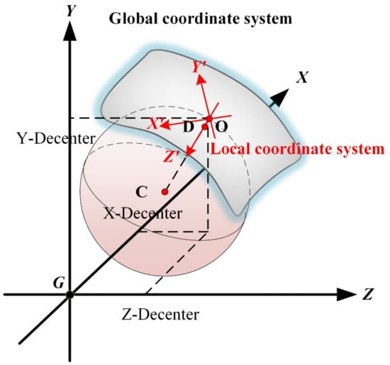 Generally, the freeform surface shape is a function of the surface sag, which varies with the coordinates in the surface local coordinate system, such as those provided by Equations (4) and (5), and this function should thus be fitted into the local coordinate system. However, the calculation process for the data points is performed in the global coordinate system. Therefore, it is first necessary to convert the coordinates and the normal vectors of the data points under the global coordinate system into the local coordinate system, i.e., to determine the relative positional relationship between the two coordinate systems.