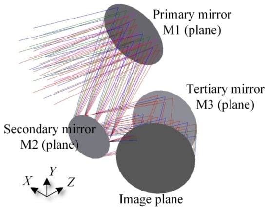 First, we determined the position parameters of the image plane with special position requirements, and then roughly estimated the volume of the system and determined the z1 coordinate of the center of the primary mirror according to the FOV, focal length, and F number of the system. Next, we provided a series of structural decision parameters α1, β1, d1, and d3, and selected a group from them to construct an initial plane structure that meets our needs and has a better convergence effect in the freeform surfaces construct process. The layout of the initial plane system we chose is shown in Figure 5. In this paper, the red, green, and blue lines in the system layout represent rays from field points (0°, 0°), (0°, −3°), and (0°, 3°), respectively.