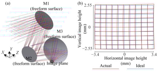 The plane system was then used to construct the initial solution of the freeform surface with approximately 570 feature light rays, which can be carried out in two minutes. The layout of the initial freeform system is shown in Figure 6a. The distortion grid of the system is shown in Figure 6b. The red line represents the actual image height, and the blue line represents the ideal image height. The system can almost achieve the given object–image relationship. This initial solution was then used as the starting point for the next optimization step.