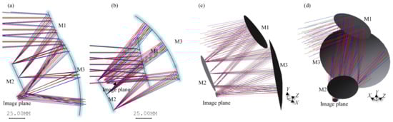 Figure 7a,b are on the same scale and show that, when compared with the conventional off-axis three-mirror system that is significantly larger in one dimension, the sizes of the optimized system based on a nonsymmetric structure were close in the three dimensions X, Y, and Z, which were approximately equal to 140, 150, and 140 mm, respectively. The light was turned three-dimensionally within the system space. Most importantly, the structure of the optimized system met the design expectations, i.e., the image plane has a 45° β tilt and the center of the image plane is located outside the YZ plane. In addition, the centers of the image plane and the secondary mirror were separated by specific distances in both the X and Y dimensions, and the tilt angles of these two planes were also different. This structure may be conducive to the application of the designed optical system in specific scenarios and may ease the installation of the detector. The optimized system is geometrically similar to the initial planar structure that was constructed by the method presented in Section 2.1. The successful design of this system shows that the use of a nonsymmetric structure allowed us to design the geometric shape of the optical system more flexibly.