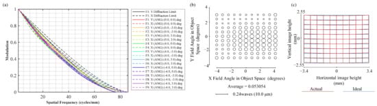 Performance of the final system: (a) the modulation transfer function, (b) RMS WFE, and (c) the distortion grid.