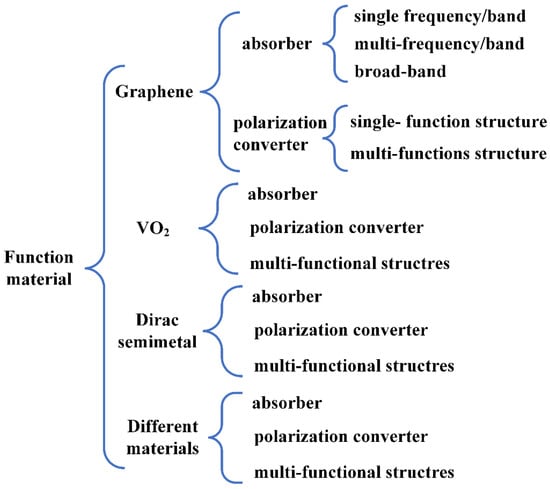 Dynamically manipulating electromagnetic waves based on switchable metamaterial structures can overcome the fundamental limitations of passive and static systems. In general, two main methods can be used to realize the tuning characteristics of the metamaterials. One method to achieve the tunability of the metamaterial is based on the mechanical reconfiguration. The implementation of this method is to tune the electromagnetic responses by changing the structures, including tuning the lattice constants, resonator structures, and spatial arrangements through external stimulation. Such changes can be applied to the entire spectrum region, but generally have a long response time [10,11,12,13,14]. The other method is to combine the metamaterial structures with the functional materials, including liquid crystals [15], black phosphorus [16,17], graphene [1], Dirac semimetal [18], phase change materials [19], and so on, treated as surrounding media or constituent materials. This method is to modulate the optical properties of the functional materials through external stimulation, thereby further realizing the dynamic control of metamaterials. Compared to the first method, the tuning method based on functional materials can perform a faster speed with narrower operation bandwidth caused by the material dispersion [2]. This paper emphasizes recent development of functional material (including graphene, vanadium dioxide (VO2), and Dirac semimetal (DSM))-based terahertz metamaterial structure for constructing absorbers, polarization converters and multi-functional devices in terahertz frequency band, which have no systematic summaries reported in relate review papers [1,2,6,15,20,21].