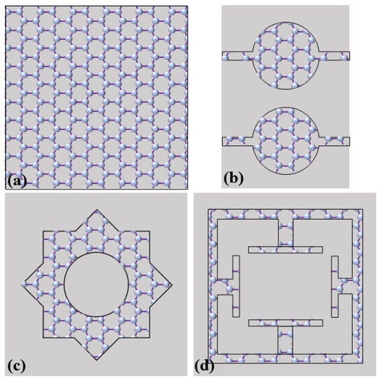 Treating the combination of graphene material and metamaterial structures, the tunable single-frequency/band terahertz metamaterial absorbers have been widely investigated. In general, the design methods and structures of the single-frequency/band graphene-based metamaterial absorbers are relatively simple. H. Xiong et al. reported a dynamical tunable terahertz graphene metamaterial absorber consisting of metal wire and continuous graphene film over the grounded dielectric absorber, as show in Figure 2a [30]. The frequency of the absorption peak increases from 6.91 THz to 8.1 THz, and the absorption decreases from −39.7 dB to −7.24 dB when the chemical potential increases from 0 to 0.4 eV. X. J. He et al. proposed a graphene-based metamaterial absorber to realize the active tunability of bandwidth, intensity and frequency [31]. The schematic diagram of graphene microstructure is given in Figure 2b. By varying reconfiguration state of two discs, the full width at half maximum (FWHM) bandwidth at 1.451 THz improves from 64 GHz to 96.8 GHz with no obvious resonant frequency shift, and the absorption amplitude at 1.461 THz achieves about 94% modulation depth. The resonant frequency of the absorption peak has a blueshift of 267 GHz. Furthermore, when the reconfiguration states switch between (0.09 eV and 0.12 eV) and (1.00 eV and 1.80 eV), the switching strength about 91.1% has been realized at 1.313 THz, with a corresponding switching contrast of 3961%. As illustrated in Figure 2c, Z. Yi et al. reported a switchable plasma metamaterial absorber composed of the graphene-based square-square-circle arrays [32]. Additionally, they used the structure as a refractive index sensor providing a sensitivity of 15,006 nm/RIU. Furthermore, we have designed switchable single-frequency terahertz metamaterial absorber containing a graphene microstructure layer, a silicon (Si) layer and a copper background [33]. The graphene microstructure is shown in Figure 2d, which contains four T-shaped graphene strips and a graphene square ring. By tuning the Fermi energy of graphene based on external bias voltage, the absorption and spectral characteristics can be changed.