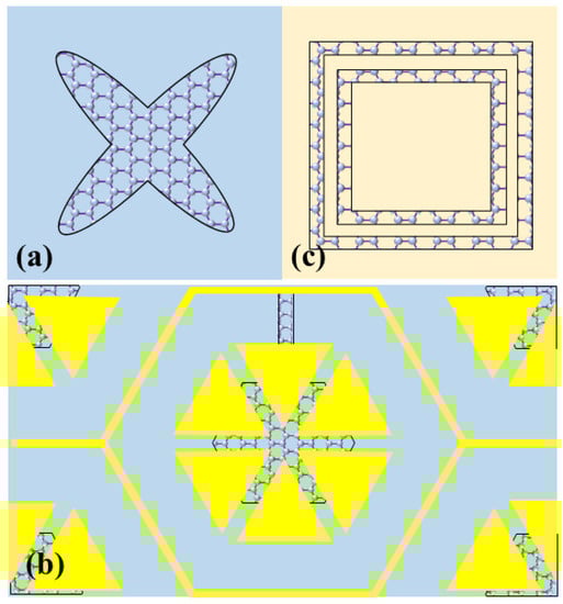 Graphene-based multi-band terahertz metamaterial absorbers using discrete graphene microstructures. (a) cross-elliptical graphene pattern [37]; (b) hybrid graphene-gold structure [50]; (c) double graphene square ring. Adapted with permission from Ref. [51], 2019, Copyright The author.