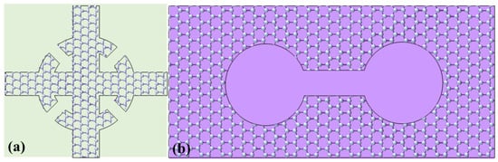 Graphene-based multi-band terahertz metamaterial absorbers using continuous graphene microstructures. (a) Graphene crossing and graphene ring with four gaps [54]; (b) dumbbell-shaped structure graphene [55].