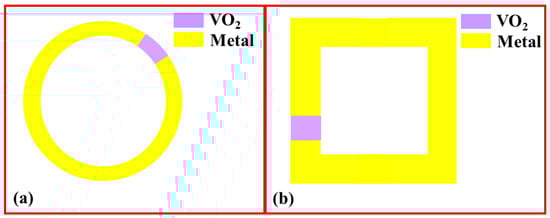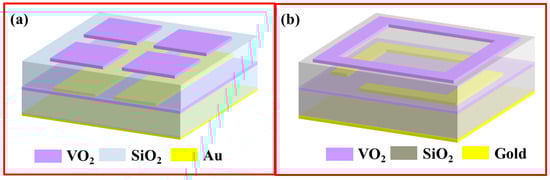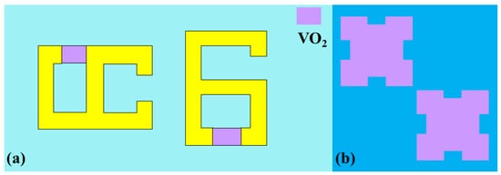 VO2-based metamaterial absorber structures. (a) Split-ring metal resonators with embedded VO2 material [138]; (b) two VO2 patterns [147].