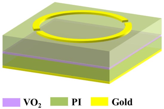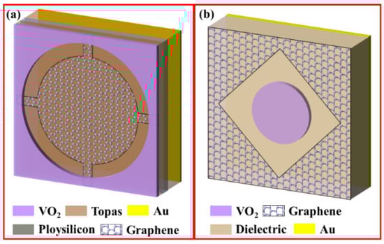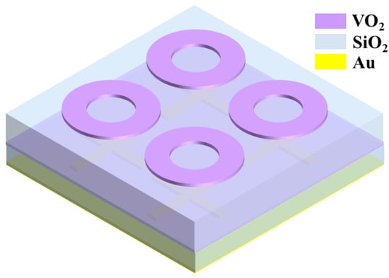 As described above, by changing the phase characteristics, VO2 can exhibit two completely different states (insulator and metal), so that two or more functions can be realized in a single structure. VO2-based metamaterial structures can perform absorption functions with different characteristics [151]. In 2020, Z. Y. Song et al. used the phase-transition characteristic of VO2 to design a multi-layer hybrid metamaterial with a switchable behavior between broad-band absorption and narrow-band absorption [151]. The structure is illustrated in Figure 12. When VO2 is in metal state, a broad-band frequency region of 0.393–0.897 THz with the absorption above 90% has been obtained. When VO2 is in insulator state, the designed structure can be used as a narrow-band absorber at the frequency of 0.677 THz.
