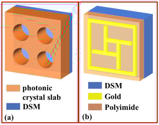 DSM-based metamaterial absorbers. (a) Photonic slabs with a thick DSM film [172]; (b) bulk DSM film layer [173].