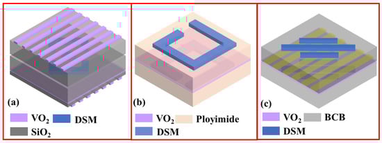 Multi-functional metamaterial structures based on the combination of VO2 and DSM. (a) LTL and LTC polarization converter [176]; (b) asymmetric transmission and dual-directional absorption [177]; (c) polarization conversion and reflection device [178].