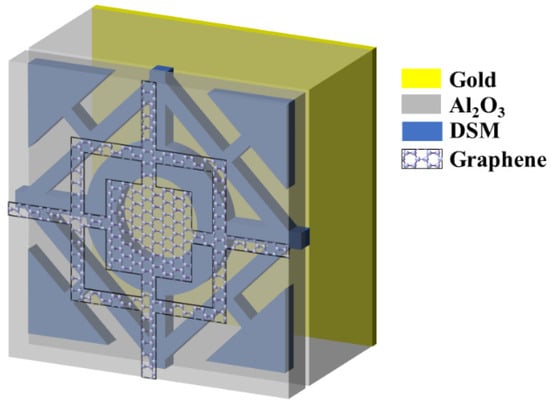 Utilizing the properties of graphene and DSM, several metamaterial structures based on the combination of them exhibit switchable characteristics by modulating the Fermi energy of graphene and DSM material, resulting in the design of absorbers [169,190,191]. H. Xiong et al. designed a dual-controlled broad-band terahertz metamaterial absorber by integrating graphene and DSM into a single structure [169]. As shown in Figure 20, the structure contains a graphene microstructure, a bulk DSM microstructure, Al2O3 layer, and a gold background. The high absorption (>90%) can be realized in a wide frequency band of 4.79–8.99 THz. The control of the absorption characteristics can be achieved independently or jointly by changing the Fermi energy of graphene or DSM rather than reconstructing the structure.