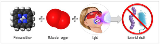 Currently, one of the most important clinical challenges in the world is the increasing resistance of bacteria to antibiotics. According to recent reports about drug-resistant infections, the actual scenario shows a risk is being posed to the ability to treat common infections with any single kind of antibiotic, with antimicrobial resistance being one of the top 10 global public health threats facing humanity [1,2]. Humans have exposed microorganisms, specifically pathogenic microbial populations, to antimicrobial agents, such as antibiotics and antiseptics, to control infectious diseases. The overuse of these substances makes disease-causing microorganisms develop various resistance mechanisms to drugs commonly used to treat them, which is a severe worldwide threat to managing infectious diseases [3]. To overcome the resistance problem, the search for alternative approaches is necessary. Antimicrobial photodynamic therapy (aPDT) has become a promising and potential treatment, since it is nontoxic, noninvasive, and has presented effective results against microorganisms, while not causing them to quickly develop resistance [4].