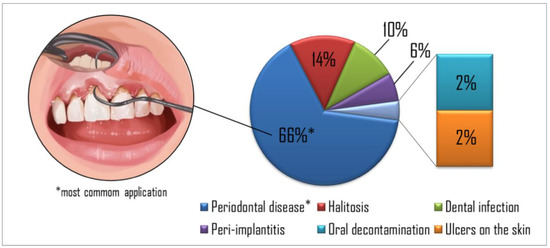The percentage of targets in the papers reviewed showed periodontal disease as the most common application found in the studies, followed by halitosis, dental infection, peri-implantitis, oral decontamination, and skin ulcers, respectively.