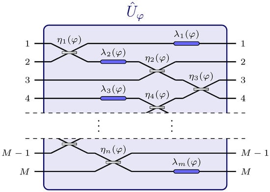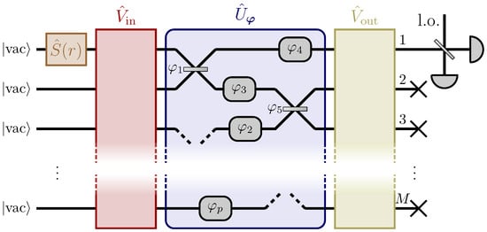 where is the squeezing operator associated with the first channel with squeezing parameter , and is the M-channel vacuum state. The average number N of photons injected in the network is thus . At the output of , a further auxiliary network is employed to refocus all the photons into a single mode, namely the first one, in order to capture all the information about the parameter in a single channel, at which homodyne detection is performed with a given local oscillator phase . For a linear passive unitary , it is possible to introduce the unitary matrix U whose elements represent the single-photon transition amplitudes from the i-th input port to the j-th output port, defined by the map