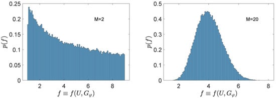 Since we are supposing that we do not possess any prior information on the structure of , all the auxiliary stages U are equivalent candidate to achieve the optimal value for the pre-factor. For this reason, we can endow U(M) with its Haar measure [56]. This is the measure on the space of the unitary matrices that generalizes the uniform distribution on finite intervals of . In fact, the Haar measure on U(M) is defined so that the measure of any open subset is invariant under left or right unitary transformations, namely , for every . In other words, it is a measure that only depends on the ‘size’ of the subsets of U(M). Once we have chosen the prescription to sample the network U, we are able to evaluate statistical properties of the pre-factor . In particular, we show in Appendix A that