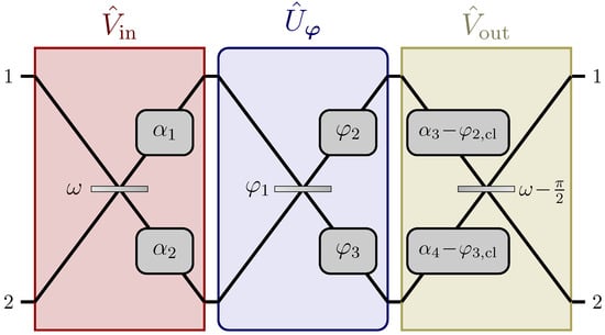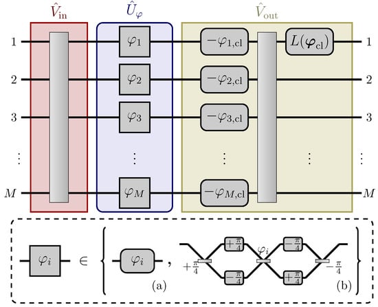 with n integer. We notice that the presence of the cosine function, which is invertible only on intervals of its argument of the type , requests a prior knowledge on the argument in order to choose the correct value of n in Equation (37). However, we will discuss in the next section that a classical coarse estimation of the parameters is required in order to optimize the network and satisfy condition (29b). In other words, the error committed in the prior coarse estimation must be of order , decreasing at the SQL with the number of photons N. For a large enough N, will be small enough to unequivocally choose the correct interval of invertibility of the cosine, and thus the correct n in Equation (37).