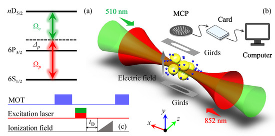 (a) Two-photon excitation diagram. The first photon, , drives the lower transition, →, and its frequency is blue shifted = 360 MHz from the state using a double-pass acousto-optic modulator (AOM). The second photon, , couples the Rydberg transition →. (b) Sketch of an experimental setup. The coupling laser = 510 nm and probe laser = 852 nm are overlapped in the MOT center to excite ground atoms (small blue balls) to Rydberg states (large yellow balls). Free ions due to the autoionization are detected with the MCP detector and recorded with a computer. (c) Experimental timing. After switching off MOT beams, the two-photon excitation lasers are turned on to excite cesium ground atoms to the Rydberg state. A ramped electric field is finally applied to ionize the Rydberg atoms after interaction time and drive free ions and Rydberg ions to the MCP detector.The rising time of the ramped field is 3 s, and the peak value is defined as .