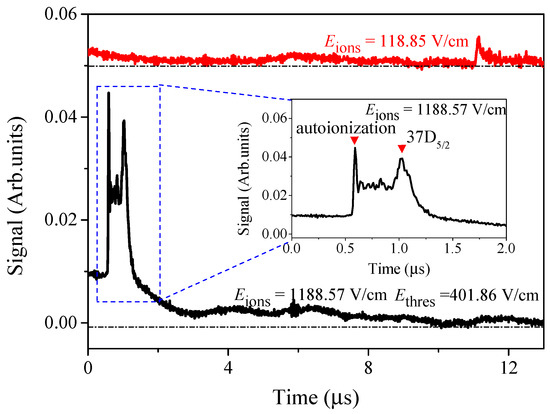 In Figure 2, we present the TOF signals of the Rydberg state with the ionization field value lower (red upper line) and higher (black lower line) than the ionization threshold (≃ 401.86 V/cm), which is defined as the threshold electric field for ionizing 37 Rydberg atoms. The TOF spectrum with the field displays two peaks at the beginning marked with the blue square, see an enlargement in the inset of the Figure 2. The first narrow peak at 0.5 s mainly comes from the autoionization ion signals, whereas the second broad peak at about 1.0 s is attributed to the field ionization of the laser-excited Rydberg atoms. The signals in the middle of the two peaks probably come from the high-lying Rydberg state produced due to the interaction. The small peak of the TOF spectrum of the field = 118.85 V/cm (much less than ), see red upper line of Figure 2, provides the evidence that the first peak in the TOF is attributed to the autoionization signals. In order to avoid the effect of the and high-lying Rydberg state, we set electric field = 265.14 V/cm to measure free ion signals.