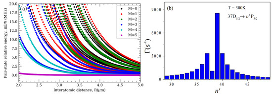 where represents the Rydberg atom with the principal quantum number n, the Rydberg pair collide with each other by the attractive interaction, one Rydberg atom is ionized and the other Rydberg atom is de-excited to a quantum state with a smaller principal quantum number, , and the ionization cross sections are typically very large. For our experiment, the penning ionization has a negligible effect because the pair displays a repulsive interaction potential. We calculate the long-range interaction potentials of the pair for = 0–5, where M = , and are the magnetic quantum numbers of atom 1 and 2, respectively. The interaction potentials are shown in Figure 3a, which shows that all components display a repulsive interaction at the atomic density used in this work. The second is associative ionization which leads to the formation of the molecular ions. It is a short-range process depending on the overlap of the wave function. The ionization probability is usually related to the initial state n and the distance R between the two Rydberg atoms. In our experiment, the atomic density is ∼ cm, which is insufficient to form molecules, so associative ionization is not the main mechanism for the formation of autoionization in this work.
