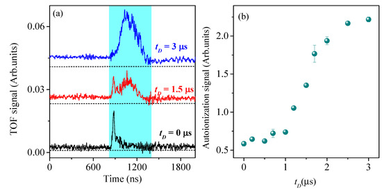 (a) Measured TOF spectra of autoionization signals for laser excitation to Rydberg state with the indicated delay time and the fixed Rydberg atomic density = 2.96 cm. The cyan region marks the boxcar gate. The ramped field . The zero point is the beginning of the ramped field. (b) Measurements of the autoionization signals of Rydberg state as the function of delay time . The data display the average of 100 measurements at the two-photon resonance.