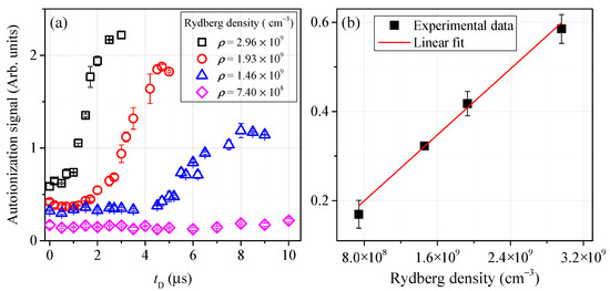 (a) Measured ion signals as a function of for an indicated Rydberg atomic density. (b) Measured autoionization signals at = 0 as a function of Rydberg atomic density.