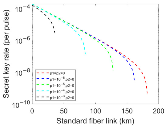Firstly, we analyze the effects of weak randomness existing only one party (Alice or Bob) in Figure 1, where we suppose Alice and Bob are symmetrical in the practical QKD system. Here, we assume which means that Eve just masters the randomness information of Alice. means that Eve has different abilities of mastering the randomness information of Alice. As shown in Figure 1, the dashed lines from right to left are obtained for different weak randomness parameters with the fixed finite number of total pulses . We can deduce that although Eve just masters the randomness information of one party when , the generation of the security key rate will be seriously affected, and the security key is no longer being generated when . Particularly, when the parameter of weak randomness rises from 0 to , the achievable transmission distance declines from 182 km to 36 km.