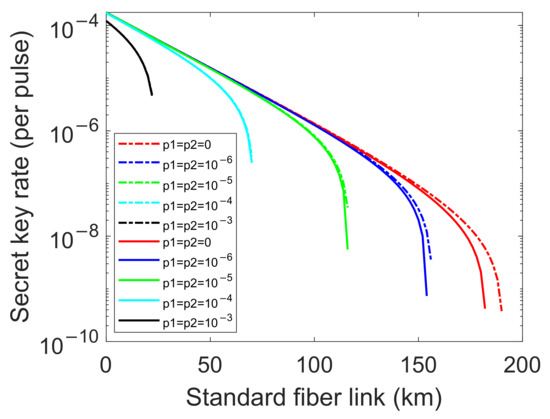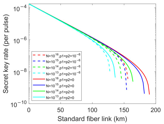 To further research the effects of the weak randomness for different N, we consider the secure key rate for with different weak randomness parameters in Figure 3. As illustrated in Figure 3, the solid lines from right to left are obtained for different weak randomness parameters with the fixed finite number of total pulses and the dashed lines from right to left are obtained for different weak randomness parameters with the fixed finite number of total pulses . We can discover that the security key rate of two different N lines are approximately asymptotic when the weak randomness parameters , which means that the influence of the weak randomness on final security key rate is stronger than the finite number of total pulses. The security key rate of two different N lines are not asymptotic when the weak randomness parameters , which means that the influence of the weak randomness on the final security key rate is weaker than the finite number of total pulses.