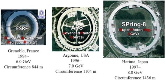 Third-generation synchrotron radiation facilities have made tremendous progress in undulator technology. The in-vacuum type [] adopted by SPring-8 as a standard undulator makes it possible to generate hard X-rays even with electrons with lower energy. Therefore, the momentum for the construction of lower-cost medium-sized synchrotron radiation facilities (~3 GeV) has increased worldwide. For example, Switzerland [] introduced SPring-8’s in-vacuum undulator technology to construct a hard X-ray undulator beamline for protein crystallography. After that, in Europe, new 3 GeV synchrotron radiation facilities were constructed in DIAMOND (UK) [], SOLEIL (France) [], and ALBA (Spain) []. Many second-generation synchrotron radiation facilities have also been refurbished to bring them closer to the third-generation standard. The NSLS-II [] in the US and the TPS [] in Taiwan have nearly become as advanced as possible in this direction.