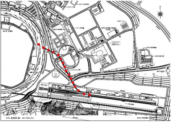 Plan view map of a part of the SPring-8 site. The straight building at the bottom of the map is the SACLA facility. Electrons generated by a gun located at the rightmost part of the facility are accelerated to the left and head toward the SPring-8 direction. Red dots show the electron beam transport from the SACLA linear accelerator to the SPring-8 storage ring.