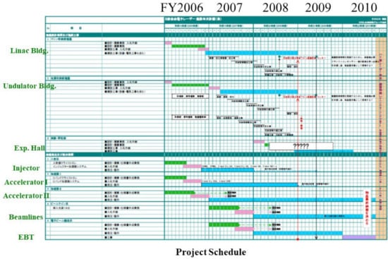 The outline of the project schedule is shown in Figure 5. The contract work for the accelerator building design started at the beginning of FY2006 and was completed in February 2007. The contract work for the construction of the accelerator building began in January 2007, followed by the construction work between March FY2007 and December FY2008. The undulator building started construction in 2007 and was finished at the end of 2008. The construction of the experimental building began at the end of 2008 and was completed in 2010. The injector’s engineering design, including the electron gun, was finished in October 2006. All items were delivered at the end of FY2007. After the offline examinations in 2008, installation and adjustments in the accelerator building began in 2009. Detailed design of some accelerator components with shorter delivery time was completed in the first half of 2006, followed by a procurement process. All components delivered by the end of 2008 were used for the installation work at the accelerator building, which was started in 2009. The remaining components were delivered in FY2010 and installed at the end of 2010. Undulator and beamline equipment started contract work in 2007 and were to be delivered by FY2010. In addition to the above, an electron beam transport to the SPring-8 Booster Synchrotron was constructed in 2010.