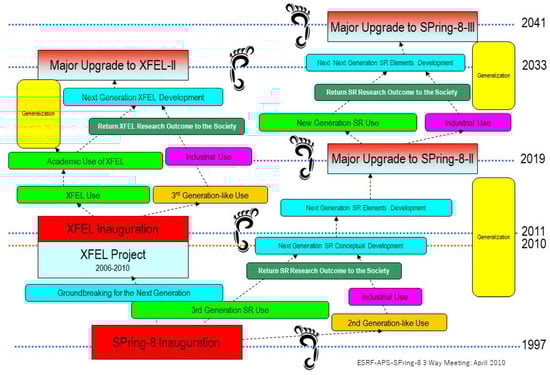 Around 2004, when we were conducting the construction campaign for SACLA, we made the first version of Figure 7. This showed that the SPring-8 site could succeed alongside the synchrotron radiation facility SPring-8 and the compact XFEL facility SACLA. The upgrade of SPring-8 (SPring-8-II) was assumed as the next step. After completing SACLA, the conceptual design of SPring-8-II began, which was planned to adopt an MBA lattice and to aim for a horizontal emittance of 100 pmrad [].