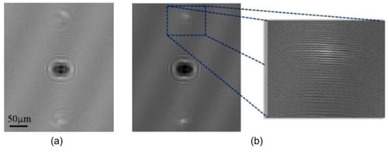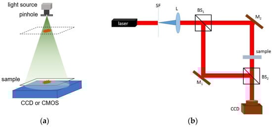 In digital holography, the amplitude and phase information of an object is encoded into a two-dimensional hologram which is generated by the interference of the object wave and the reference light [7]. Based on the system configuration, the digital holography can be mainly divided into two categories: in-line digital holography and off-axis digital holography. For the in-line setup, the object wave and the reference wave are in a line [8,9], while there is an angle between them for the off-axis counterpart [8,10,11]. Generally, the transparent and semi-transparent samples can be imaged by the in-line digital holography. Figure 1a shows a typical in-line holography schematic, which is also called as lensless digital holographic microscopy (LDHM) [12]. The light source passes through a pinhole and illuminates the sample, and the scattered light of the sample interferes with the non-scattered light [13]. The sensor records the holograms, from which the scattered object wave is numerically reconstructed [14]. Without imaging lenses and alignment mechanics, and other bulky optical components, the LDHM is extremely compact, cost-effective and light weight. Moreover, the field of view (FOV) and resolution are decoupled from each other: the resolution generally depends on the pixel size of the image sensor chip and the detection signal-to-noise ratio (SNR), whereas the sample FOV is equal to the entire active area of the sensor chip, which is, e.g., 20–30 mm2 for a state-of-the-art complementary metal oxide semiconductor (CMOS) imager chip and it can reach about 10–20 cm2 for a Charge-Coupled-Device (CCD) [15,16,17]. In the system setup, as shown in [18] and [19], the sample was placed close to the pinhole. This system is usually suitable for small samples, and the distance from the pinhole to the CCD is relatively small, such as 15 mm [20]. An advantage of this setup is that the system can record the hologram even if the object is opaque. Figure 1b shows another in-line holography setup based on the Mach–Zehnder interferometer, where the laser is divided into two beams by a beam splitter. One beam is reflected by the reflector M2 and irradiates the object to form object light. The other one is reflected by the reflector M1 to form reference light. Two light beams interfere to form a hologram which is recorded by the CCD. If the M1 mirror is rotated and there is an angle between the object light and the reference light when they incident on the CCD, the system is a typical off-axis arrangement [21]. Similar to the in-line hologram, an off-axis hologram is also composed of zero-order diffraction and ±1-order diffraction of illumination light. Because there is a certain angle between the object light and the reference light, the propagation direction of the three diffraction levels is different. It is easier to eliminate the twin image for off-axis holography compared with the in-line configuration [10]. When the angle is properly adjusted between object light and reference light during recording, the real image and the twin image can be separated. Specifically, the angle should be larger than: