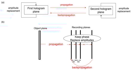 To eliminate the twin images some non-iterative methods have been presented such as averaging holograms of different recording distances [26]. The most popular iterative method is the Gerchberg–Saxton(GS) iterative algorithm [27], which is depicted in Figure 3a, where two recording planes are required. The complex amplitude is obtained by combining the square root of the amplitude of the first recording plane with an initial phase estimation. The angle spectrum theory is utilized for the object wave to propagate to the second recording plane. The phase is maintained and the amplitude is replaced by the square root of the amplitude of the second recording plane to obtain a new complex amplitude. This complex amplitude is then back propagated to the first recording plane. The twin image can be eliminated by repeating the process. As shown in Figure 3b, the multi-height phase iterative algorithm is an improvement on the GS algorithm [28,29], which iterates using eight holograms of different heights, typically 15 μm apart. Usually, it can obtain good results after iterating 10–20 times. Using the transport of intensity equation (TIE) [30,31], a nearly global optimal phase distribution can be obtained. With TIE, not only the locally optimal solution is avoided, but also the convergence is sped up. Considering the positive absorption of an object, the amplitude of the wave front should not be greater than 1 at the object plane [32]. The process of propagating to the object plane is added to the GS iteration, and the portion whose amplitude is greater than 1 is changed to 1, and the corresponding phase becomes 0.