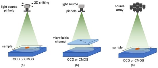 The resolution of lensless holographic microscopy primarily depends on the pixel size of the sensor chip, resulting in under-sampling of the high-frequency information. In terms of hardware, it is undoubtedly that using a detector with a smaller pixel size increases the spatial resolution. At present, the smallest pixel size of the CMOS sensors is about 1 µm which is not high enough for the microscale biomedical research. Fortunately, the pixel super-resolution algorithm can break through the limitation caused by the hardware pixel size [45]. Usually, the pixel super-resolution algorithm acquires multiple holograms of low resolution to synthesize high-resolution holograms by moving the holograms in sub-pixel increments. Sub-pixel movement between these holograms can be achieved by moving the light source [46], the sample [47], or the detector, as shown in Figure 5. Illuminating the object sequentially by each source in the source array is an equivalent way to realize the source shifting, which is illustrated in Figure 5c [48]. Figure 6 shows the difference between before and after using the pixel super-resolution algorithm. Figure 6b contains more high-frequency information that is not collected in the lower-resolution holograms. The pixel size of the digital hologram is reduced by six times [47] when a 2.2 µm imaging sensor is used. In [49], Gao et al. combined the phase retrieval and pixel super-resolution techniques as a unified optimization problem and proposed a generalized algorithmic framework to solve the problem. Half-pitch resolution is achieved for the experimental data acquired by an imaging sensor with a pixel pitch of 3.8 µm. In [50], four independent linear equations that relate frequency components in four aliased sub-pixel shifted images to unaliased frequency components in a super-resolution image were first derived. Then a predetermined inverse matrix was used to calculate the frequency components of a super-resolution image from those of four under-sampled images. The results show that the proposed non-iterative sub-pixel shifting super-resolution technique that can enhance the resolution of LDH by a factor of two with a 1.67 µm imaging sensor.