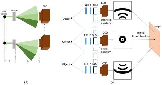 Synthetic aperture is a well-known super-resolution technique which extends the resolution capabilities of an imaging system beyond the theoretical Rayleigh limit dictated by the system’s actual aperture. Synthetic aperture technology (SA) was first applied to radar [51]. The synthetic aperture is generated by angular multiplexing, which is implemented by tilted beam illumination over the object and allows the recovery of additional spatial frequencies falling outside the digital camera sensible area when on-axis illumination is used. Using this idea, the numerical aperture (NA) of the system can be improved. A typical system setup is shown in Figure 7a [52]. The point source is moved to several off-axis positions to provide different illumination angles. In [53], the authors proposed a lensless system containing a BPF, a polarizer, a spatial light modulator (SLM), and a digital camera. The system is shown in Figure 7b whose effective aperture is three times larger than those used alone. The synthetic aperture was implemented by shifting the BPF-polarizer-SLM-camera set, located across the field of view among several viewpoints. In theory, this configuration can be extended to enlarge the NA by an arbitrary factor. In [54], the superresolution is achieved by linearly moving the inspected object. In [55], the spatial resolution is improved by recording a small number of holograms featuring varying angles of incidence based on the synthetic spectrum normalization. SA was also applied to terahertz in-line digital holography [56] and a one-shot synthetic aperture digital holographic microscopy was proposed by using a combination of angular-multiplexing and coherence gating to achieve super-resolution imaging in a single exposure [57].