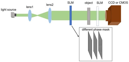 The imaging quality can be improved by adding an SLM to the lensless holographic imaging system. As shown in Figure 8, the SLM behind the laser acts as a phase mask, and the phase modulated beam that passes the SLM illuminates the sample to form holograms on the detector plane. This method can suppress the twin image [58]. At the same position, the SLM is used to generate multiple mask modes to encode the sample information. The sensor records a set of images and then synthesizes images with improved resolution and high SNR [59]. It is worth noting that the sparse phase and amplitude reconstruction (SPAR) algorithm as a phase retrieval method is proposed due to the random phase modulation and some noise with Poisson distribution [60]. In addition, the SLM can also be placed between the object and the detector as denoted by the dotted line in Figure 8. By loading the distribution of the diffraction grating into the SLM, the detector collects more light, including high-frequency information of the object [61]. For example, [62] used an adjustable one-dimensional cosine grating mode to achieve higher resolution.