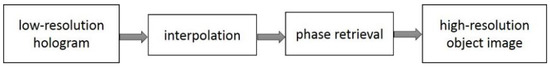 A disadvantage of this method is that the information added to the image is estimated and not completely correct. This process is also affected by the twin image, as the twin image can interfere with image detail. Therefore, combining phase iteration and interpolation can improve image resolution without artifacts [70], which is illustrated in Figure 10. In this algorithm, the optical field is propagated back and forth between the sample plane and the sensor plane while using the measured intensity and a priori information about the sample as constraints, following Gerchberg–Saxton and Fienup’s methods. Before the iteration, the intensity data matrix measured by the sensor is interpolated to enlarge the matrix dimension and thus effectively reduce the pixel size. During the iteration, the sensor plane constraints are applied on only the measured intensity location but not the interpolated data location. The resolution is improved about 1.26 times using a sensor with pixel size of 2.2 μm.