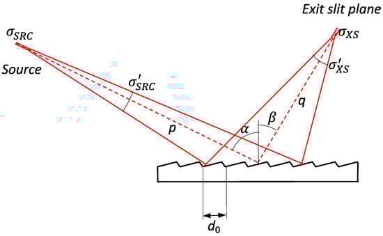 The imposed long separation between the grating and the exit slit is, in principle, a positive factor to achieve larger resolving power (see Equation (18)). Obviously, a large q helps achieving a small . However, as a drawback, such a large focal distance makes the quest for transform limited low-resolution operation more difficult. Moreover, the effect of vibrations and slope errors increase with larger focal distances. This effect plays an important role in reducing the resolution (increasing the monochromatic image). Then, of course, there is the effect of the illuminated lines. Equation (10) can be rewritten in terms of FWHM (for both the energy bandwidth and the number of illuminated lines by the beam) as: