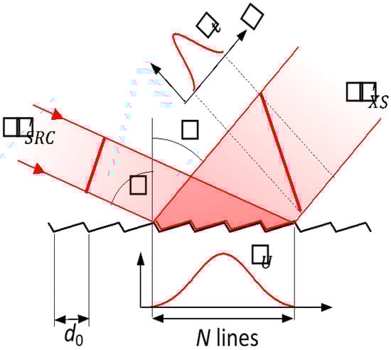 The stretching of the pulses is proportional to the number of illuminated lines. Therefore, one easy way to reduce it is to clip the beam. It can be done by using slits upstream the monochromator to have fewer illuminated lines. When this is done, the beam footprint on the grating is limited to a length L over the grating. It can be considered more or less uniform, depending on how much the beam is clipped. We analyze this case, using the same optical scheme given in Figure 1, with the beam footprint on the grating almost uniform within L. It means that all the N lines (defined as ) are illuminated with identical intensity.