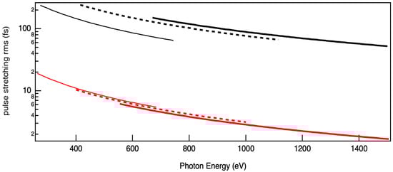 While current state of the art allows for almost-negligible contribution from slope errors and aberrations, the slit size must be sufficiently open to transmit enough flux. The ratio resolution-flux is normally optimized when the slit size matches the monochromatic FWHM spot size. In this case, both terms under the square root of Equation (20) are roughly equal. The resolution and the pulse stretching are, therefore, degraded by a factor about with respect to the values given in Section 2.2 and Section 2.3.