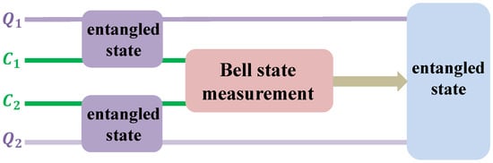 Since the theory of quantum mechanics was proposed, it has never ceased exploring the physical properties of the world. As revealed by Einstein, Podolsky, and Rosen in their seminal paper [1], when two subsystems are prepared in an entangled state, their properties exhibit nonlocal correlations even if they are separated in space. This feature is in sharp contrast with local realism, which assumes that the observable of an object has definite values no matter whether they are measured or not, and they are not affected by events taking place sufficiently far away. The nonlocal correlation can be captured by the violation of Bell’s inequalities [2,3]. Besides being central to the fundamentals of quantum mechanics, entanglement is also of great importance in the work of many quantum information tasks such as quantum teleportation [4] and measurement-based quantum computation [5]. Due to such nonlocal properties, two particles initially without any interaction could be put into an entangled state through certain ways of nonlocal manipulation, for which entanglement swapping is one of the unique ways [6]. The sketch of entanglement swapping is shown in Figure 1.