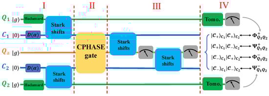 Simulated experimental sequences. The procedure consists of four parts: (I) Generation of entangled states for , and , through the Stark shifts induced by dispersive qubit–cavity interaction; (II) application of a CPHASE gate operation on the two cavities to transform the entangled coherent state elements into the direct product of even or odd cat elements; (III) distinguishing the four combinations of cat states of the two cavities to collapse the two qubits into a specific entangled state; and (IV) reconstruction of the density matrices for and , which can be achieved by standard process of quantum state tomography, as reported in the previously demonstrated experiments [19,39,40].