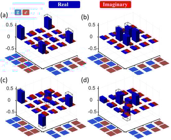 After the analysis of the states of cavities, we extract the density matrix of joint 2-qubit state for and , which is achieved through the standard process of quantum state tomography [19,39,40]. The measured density matrices of and , conditional on the measurement outcomes , , , and of the twice measurement of corresponding to , , , and of and , are displayed in Figure 3, where the black wire frames denote the matrix elements of the ideal states.