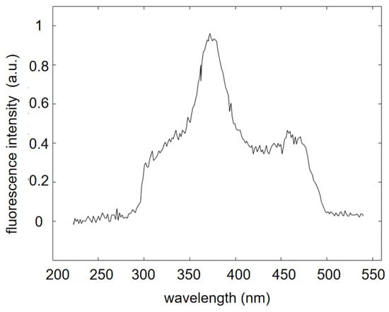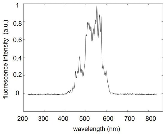 Due to the complex energy level structure of Tm ions, Tm ions are very easy to up-convert the infrared pump light into blue and ultraviolet light [,]. The blue light was observed in Tm-doped fiber pumped by laser sources ranging from 1.06 to 1.14 µm [,,,,], which is the 1G4–3H6 transition of Tm ions produced by three-photon absorption. Through avalanche upconversion and ETU, pumping with the wavelength of 790 nm can also produce blue light in Tm-doped fiber []. This conclusion is also confirmed in our experiment, which shows the spectrum of Tm-doped fiber pumped by laser at 793 nm in Figure 1. It is known that Tm ions with 1G4 level exhibit a strong absorption band at approximately 488 nm and Tm ions at 1G4 level can be excited to 1I6–3P0 levels by excited-state absorption (ESA), so as to upconvert 488 nm radiation to ultraviolet source [].