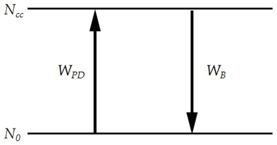 Darkening is a process of continuous competition between PD and bleaching. In this paper, a semi-empirical formula for the PD and bleaching process is established by imitating a two-level laser system, as shown in Figure 2.