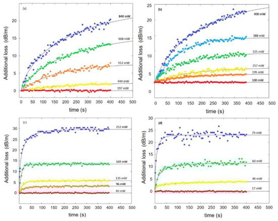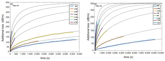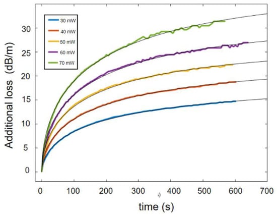 We also digitized their experimental data, and converted the original transmission into additional loss (dB/m) at different pump powers, and fitted it with Formula (11). As shown in Figure 6. The colorful lines are the plotted experimental data while the black lines are plotted by fitting data.